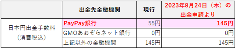 2023年8月24日(木)より、PayPay銀行における出金手数料を以下の通り改定いたします。